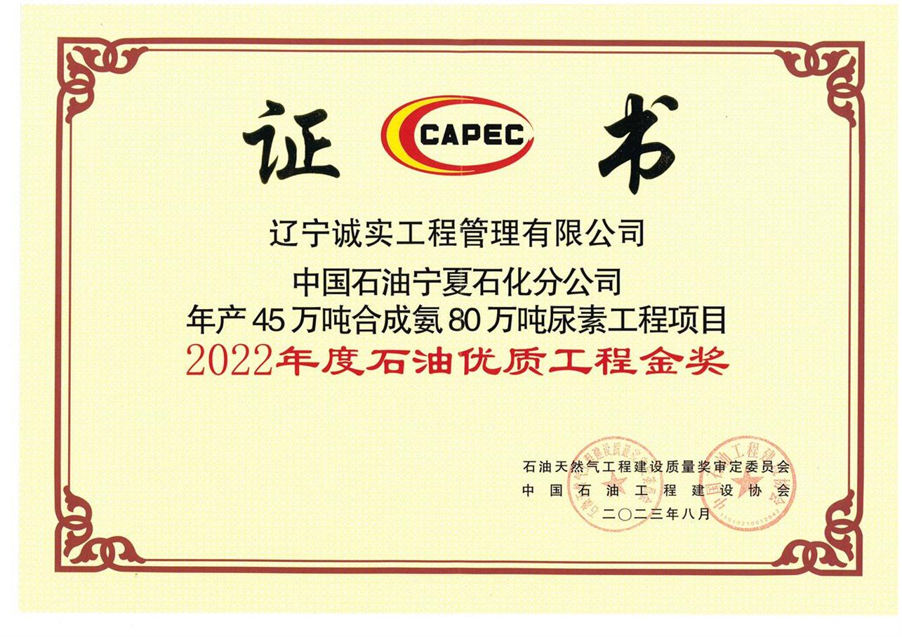 熱烈祝賀寧夏石化年產(chǎn)45萬噸合成氨80萬噸尿素工程項(xiàng)目榮獲2022年度石油優(yōu)質(zhì)工程金獎(jiǎng)