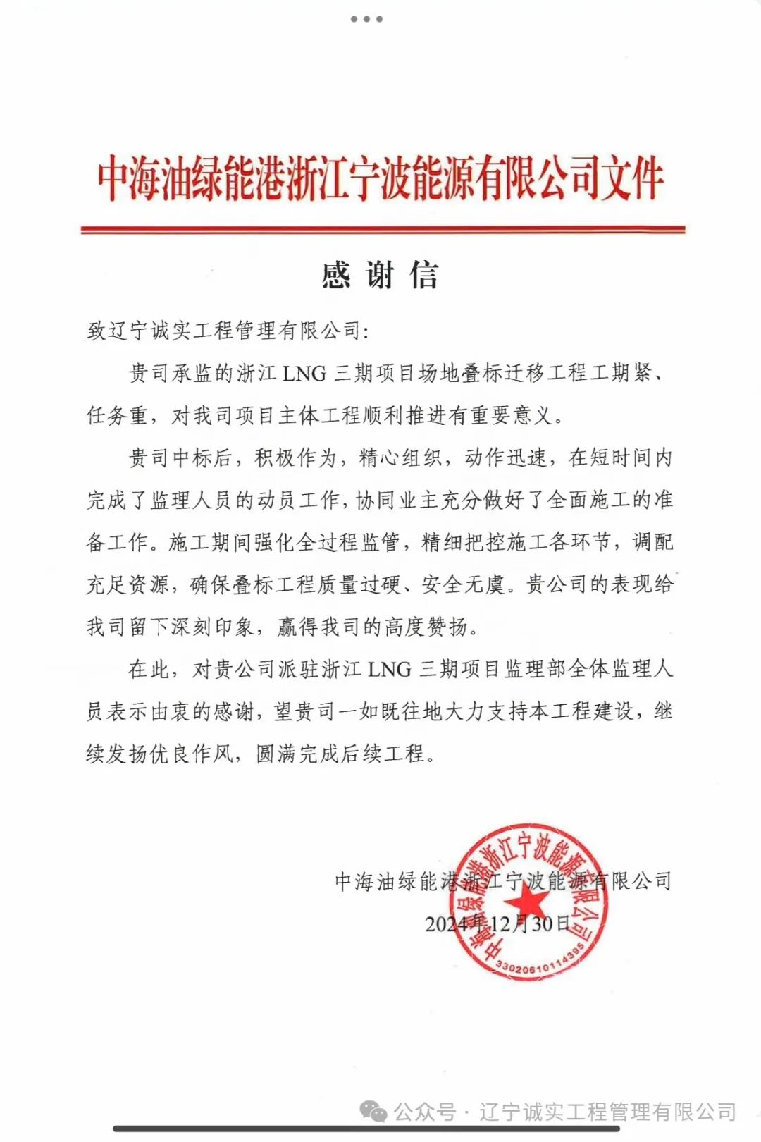 至此2025元旦來臨之際,浙江LNG三期項目場地疊標遷移項目部收獲來自于中海油綠能港浙江寧波能源有限公司發(fā)來的一封感謝信。